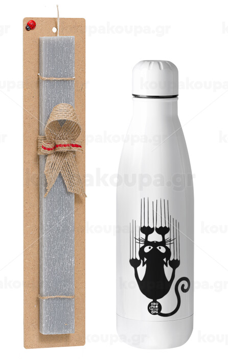 Cat scratching, Πασχαλινή Λαμπάδα με μεταλλικό παγούρι θερμός ανοξείδωτο (500ml) & κερί αρωματικό πλακέ (30cm) (ΓΚΡΙ)