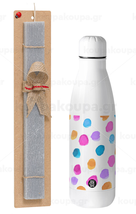 Watercolor dots, Πασχαλινή Λαμπάδα με μεταλλικό παγούρι θερμός ανοξείδωτο (500ml) & κερί αρωματικό πλακέ (30cm) (ΓΚΡΙ)