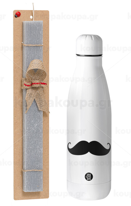 Μουστάκι, Πασχαλινή Λαμπάδα με μεταλλικό παγούρι θερμός ανοξείδωτο (500ml) & κερί αρωματικό πλακέ (30cm) (ΓΚΡΙ)