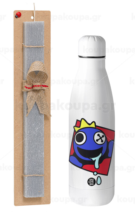 Blue, Rainbow friends, Πασχαλινή Λαμπάδα με μεταλλικό παγούρι θερμός ανοξείδωτο (500ml) & κερί αρωματικό πλακέ (30cm) (ΓΚΡΙ)