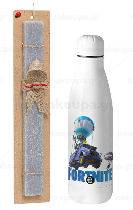 Fortnite Bus, Πασχαλινή Λαμπάδα με μεταλλικό παγούρι θερμός ανοξείδωτο (500ml) & κερί αρωματικό πλακέ (30cm) (ΓΚΡΙ)