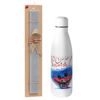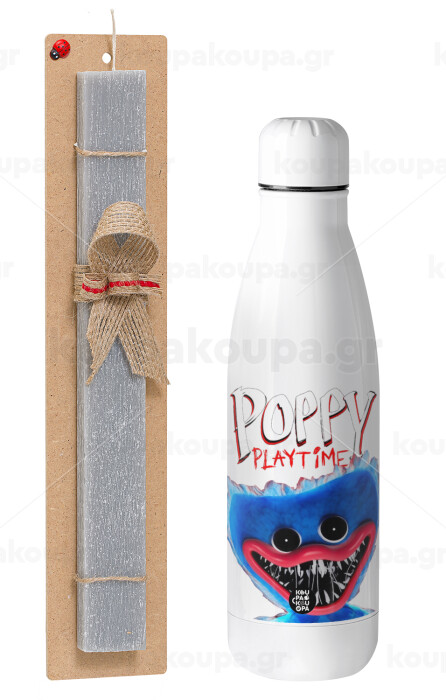 Poppy Playtime Huggy wuggy, Πασχαλινή Λαμπάδα με μεταλλικό παγούρι θερμός ανοξείδωτο (500ml) & κερί αρωματικό πλακέ (30cm) (ΓΚΡΙ)