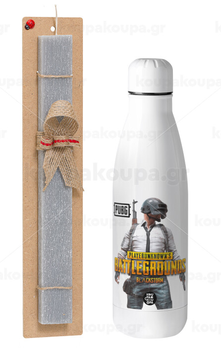 PUBG battleground royale, Πασχαλινή Λαμπάδα με μεταλλικό παγούρι θερμός ανοξείδωτο (500ml) & κερί αρωματικό πλακέ (30cm) (ΓΚΡΙ)