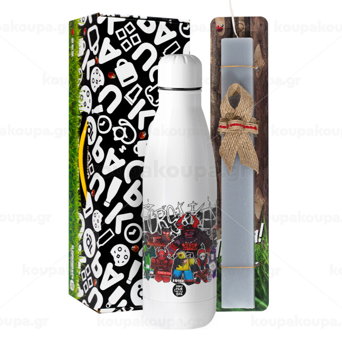Roblox Forsaken, Πασχαλινή Λαμπάδα με μεταλλικό παγούρι θερμός ανοξείδωτο (500ml) & κερί αρωματικό πλακέ (30cm) (ΓΚΡΙ)