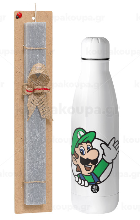 Super mario Luigi win, Πασχαλινή Λαμπάδα με μεταλλικό παγούρι θερμός ανοξείδωτο (500ml) & κερί αρωματικό πλακέ (30cm) (ΓΚΡΙ)