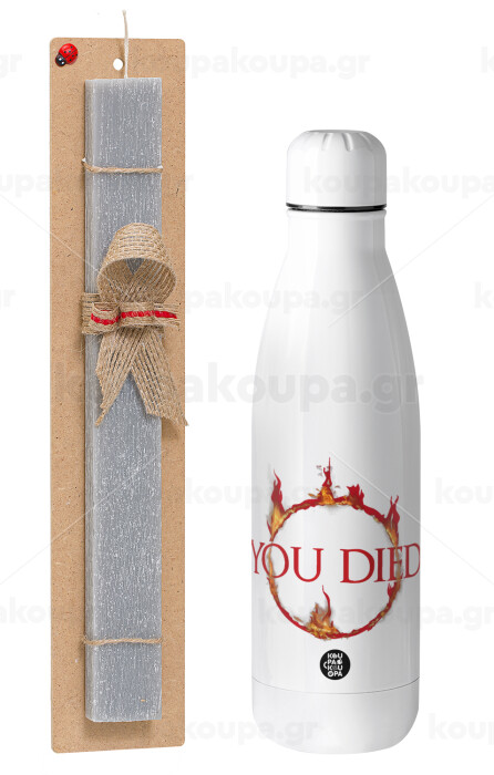 You Died | Dark Souls, Πασχαλινή Λαμπάδα με μεταλλικό παγούρι θερμός ανοξείδωτο (500ml) & κερί αρωματικό πλακέ (30cm) (ΓΚΡΙ)