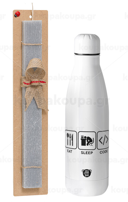 Eat Sleep Code, Πασχαλινή Λαμπάδα με μεταλλικό παγούρι θερμός ανοξείδωτο (500ml) & κερί αρωματικό πλακέ (30cm) (ΓΚΡΙ)