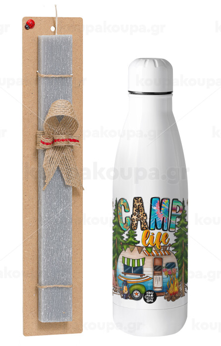 Camp Life, Πασχαλινή Λαμπάδα με μεταλλικό παγούρι θερμός ανοξείδωτο (500ml) & κερί αρωματικό πλακέ (30cm) (ΓΚΡΙ)