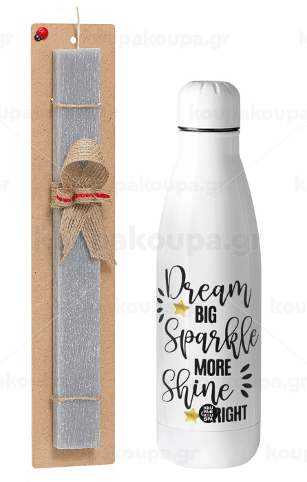 Dream big, Sparkle more, Shine bright, Πασχαλινή Λαμπάδα με μεταλλικό παγούρι θερμός ανοξείδωτο (500ml) & κερί αρωματικό πλακέ (30cm) (ΓΚΡΙ)