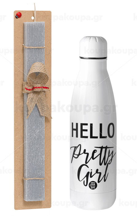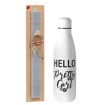 Hello pretty girl, Πασχαλινή Λαμπάδα με μεταλλικό παγούρι θερμός ανοξείδωτο (500ml) & κερί αρωματικό πλακέ (30cm) (ΓΚΡΙ)