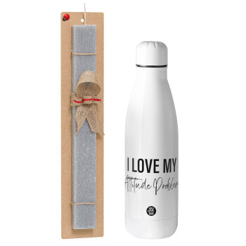 I love my attitude problem, Πασχαλινή Λαμπάδα με μεταλλικό παγούρι θερμός ανοξείδωτο (500ml) & κερί αρωματικό πλακέ (30cm) (ΓΚΡΙ)