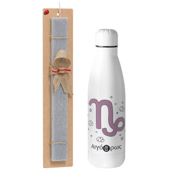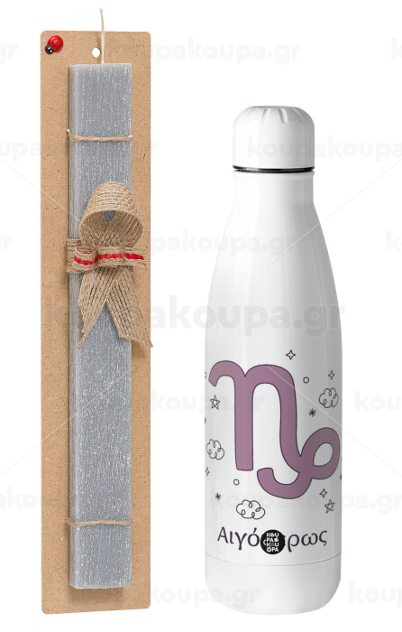 Ζώδια Αιγόκερως, Πασχαλινή Λαμπάδα με μεταλλικό παγούρι θερμός ανοξείδωτο (500ml) & κερί αρωματικό πλακέ (30cm) (ΓΚΡΙ)