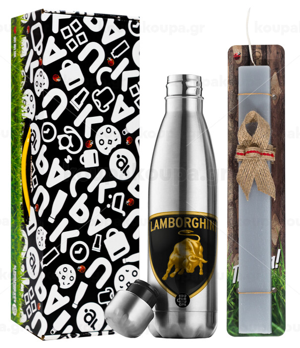 Lamborghini, Πασχαλινή Λαμπάδα με μεταλλικό παγούρι θερμός ανοξείδωτο (500ml) & κερί αρωματικό πλακέ (30cm) (ΓΚΡΙ)