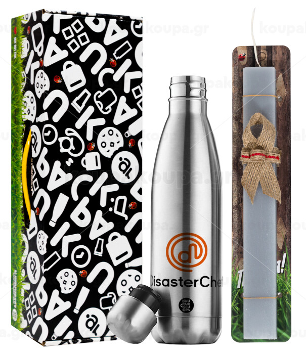 Disaster Chef, Πασχαλινή Λαμπάδα με μεταλλικό παγούρι θερμός ανοξείδωτο (500ml) & κερί αρωματικό πλακέ (30cm) (ΓΚΡΙ)