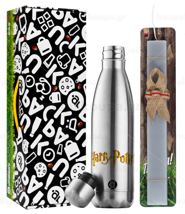 Harry potter movie, Πασχαλινή Λαμπάδα με μεταλλικό παγούρι θερμός ανοξείδωτο (500ml) & κερί αρωματικό πλακέ (30cm) (ΓΚΡΙ)