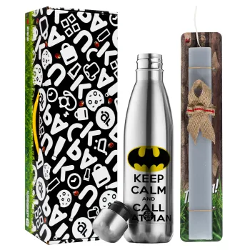 KEEP CALM & Call BATMAN, Πασχαλινή Λαμπάδα με μεταλλικό παγούρι θερμός ανοξείδωτο (500ml) & κερί αρωματικό πλακέ (30cm) (ΓΚΡΙ)