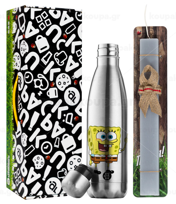Μπομπ Σφουγγαράκης character, Πασχαλινή Λαμπάδα με μεταλλικό παγούρι θερμός ανοξείδωτο (500ml) & κερί αρωματικό πλακέ (30cm) (ΓΚΡΙ)