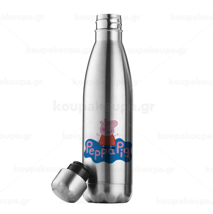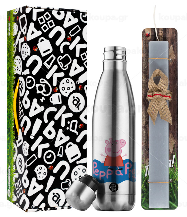 Πέππα το γουρουνάκι μπλε με όνομα, Πασχαλινή Λαμπάδα με μεταλλικό παγούρι θερμός ανοξείδωτο (500ml) & κερί αρωματικό πλακέ (30cm) (ΓΚΡΙ)