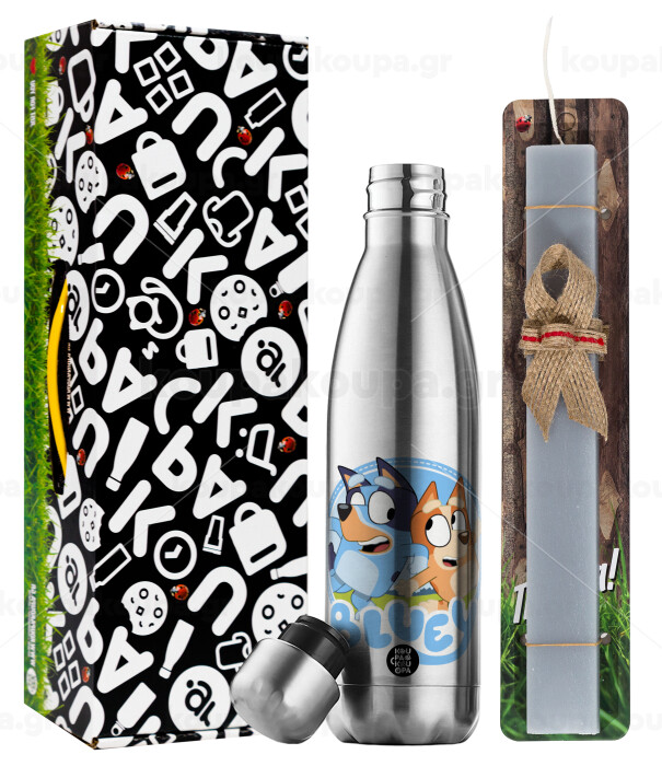 Μπλε, Πασχαλινή Λαμπάδα με μεταλλικό παγούρι θερμός ανοξείδωτο (500ml) & κερί αρωματικό πλακέ (30cm) (ΓΚΡΙ)
