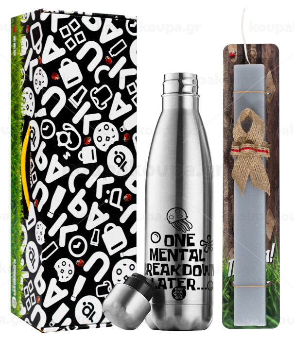 one mental breakdown later bob spongebob, Πασχαλινή Λαμπάδα με μεταλλικό παγούρι θερμός ανοξείδωτο (500ml) & κερί αρωματικό πλακέ (30cm) (ΓΚΡΙ)