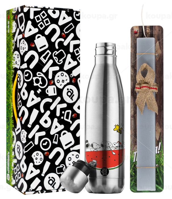 Snoopy summer, Πασχαλινή Λαμπάδα με μεταλλικό παγούρι θερμός ανοξείδωτο (500ml) & κερί αρωματικό πλακέ (30cm) (ΓΚΡΙ)