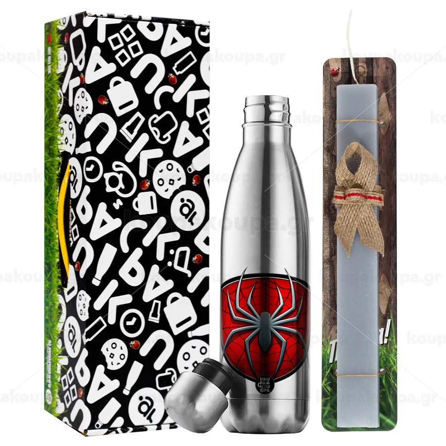 Spider-man, Πασχαλινή Λαμπάδα με μεταλλικό παγούρι θερμός ανοξείδωτο (500ml) & κερί αρωματικό πλακέ (30cm) (ΓΚΡΙ)
