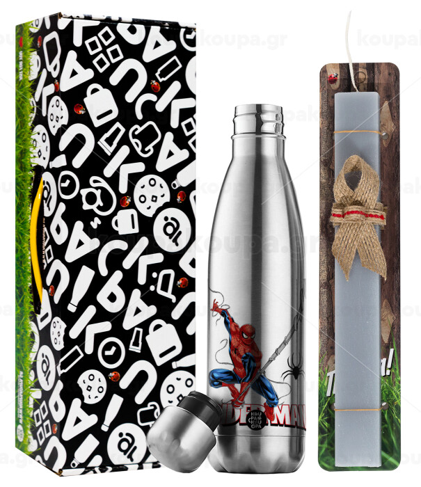 Spiderman fly, Πασχαλινή Λαμπάδα με μεταλλικό παγούρι θερμός ανοξείδωτο (500ml) & κερί αρωματικό πλακέ (30cm) (ΓΚΡΙ)