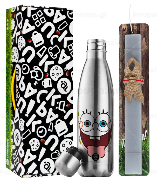 Μπομπ Σφουγγαράκης χαμόγελο, Πασχαλινή Λαμπάδα με μεταλλικό παγούρι θερμός ανοξείδωτο (500ml) & κερί αρωματικό πλακέ (30cm) (ΓΚΡΙ)