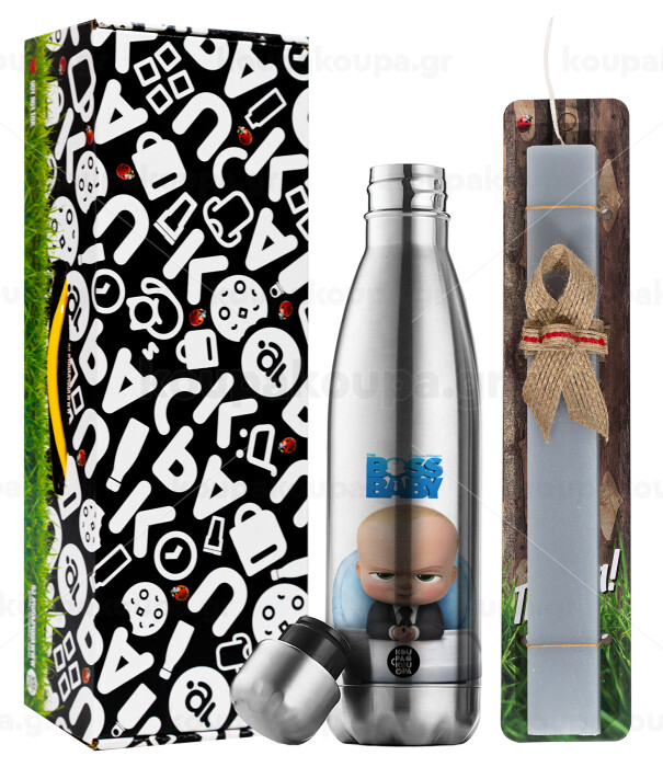 The boss baby, Πασχαλινή Λαμπάδα με μεταλλικό παγούρι θερμός ανοξείδωτο (500ml) & κερί αρωματικό πλακέ (30cm) (ΓΚΡΙ)