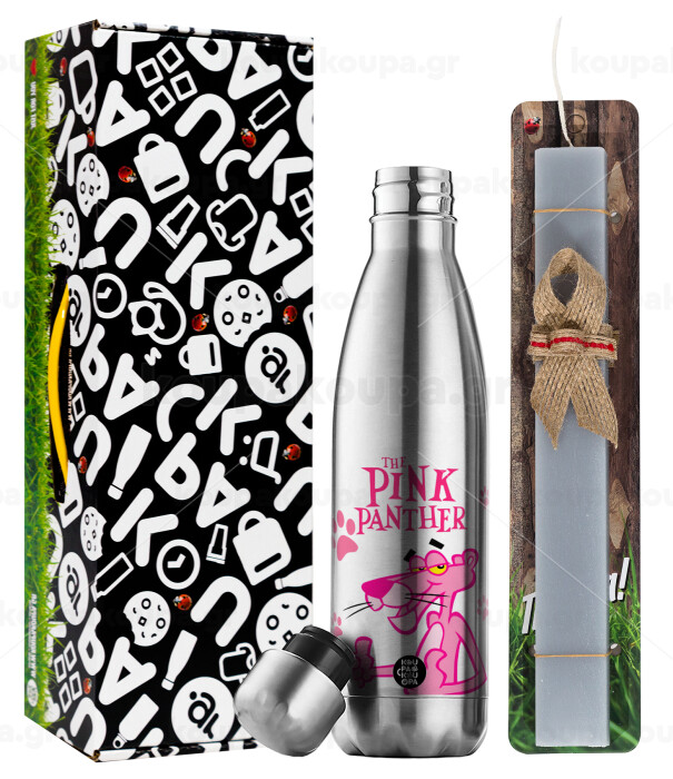 The pink panther, Πασχαλινή Λαμπάδα με μεταλλικό παγούρι θερμός ανοξείδωτο (500ml) & κερί αρωματικό πλακέ (30cm) (ΓΚΡΙ)