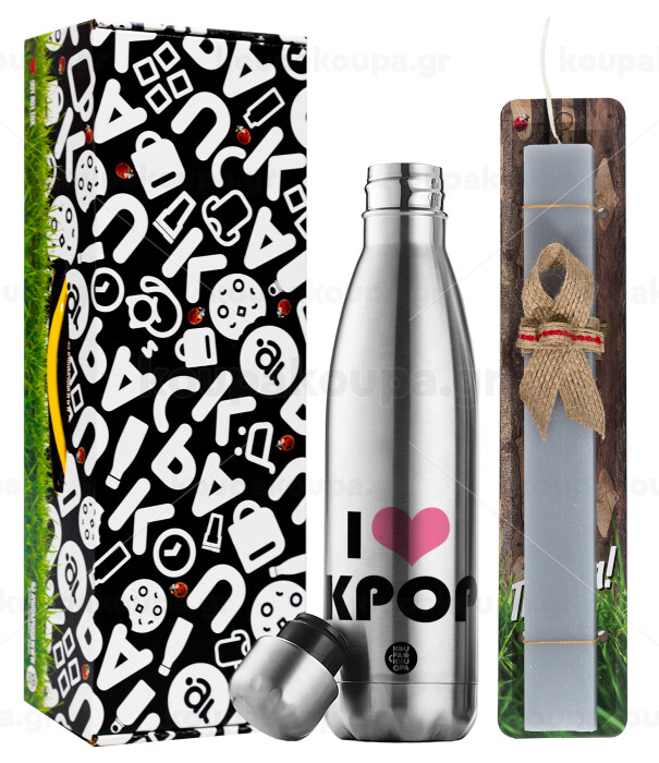 I Love KPOP, Πασχαλινή Λαμπάδα με μεταλλικό παγούρι θερμός ανοξείδωτο (500ml) & κερί αρωματικό πλακέ (30cm) (ΓΚΡΙ)