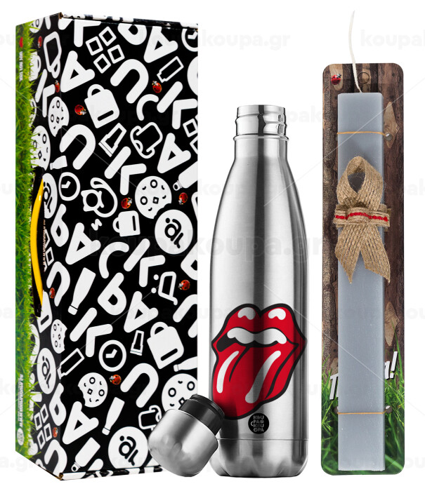 Rolling Stones Kiss, Πασχαλινή Λαμπάδα με μεταλλικό παγούρι θερμός ανοξείδωτο (500ml) & κερί αρωματικό πλακέ (30cm) (ΓΚΡΙ)