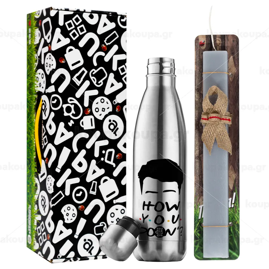 Friends how you doin?, Πασχαλινή Λαμπάδα με μεταλλικό παγούρι θερμός ανοξείδωτο (500ml) & κερί αρωματικό πλακέ (30cm) (ΓΚΡΙ)