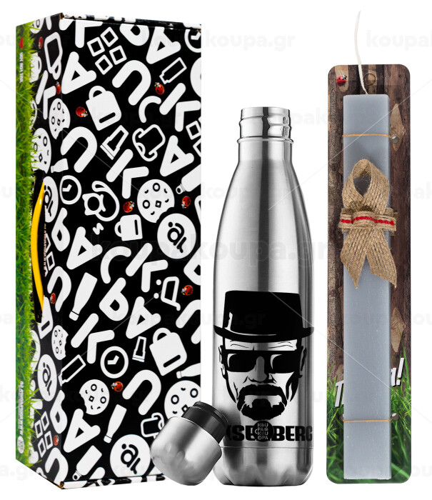 Heisenberg breaking bad, Πασχαλινή Λαμπάδα με μεταλλικό παγούρι θερμός ανοξείδωτο (500ml) & κερί αρωματικό πλακέ (30cm) (ΓΚΡΙ)