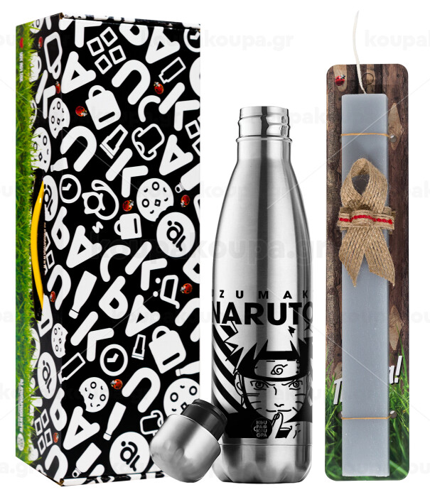 Naruto uzumaki, Πασχαλινή Λαμπάδα με μεταλλικό παγούρι θερμός ανοξείδωτο (500ml) & κερί αρωματικό πλακέ (30cm) (ΓΚΡΙ)