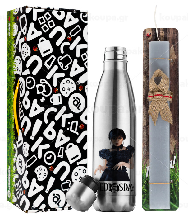 Wednesday Adams, dance with hands, Πασχαλινή Λαμπάδα με μεταλλικό παγούρι θερμός ανοξείδωτο (500ml) & κερί αρωματικό πλακέ (30cm) (ΓΚΡΙ)