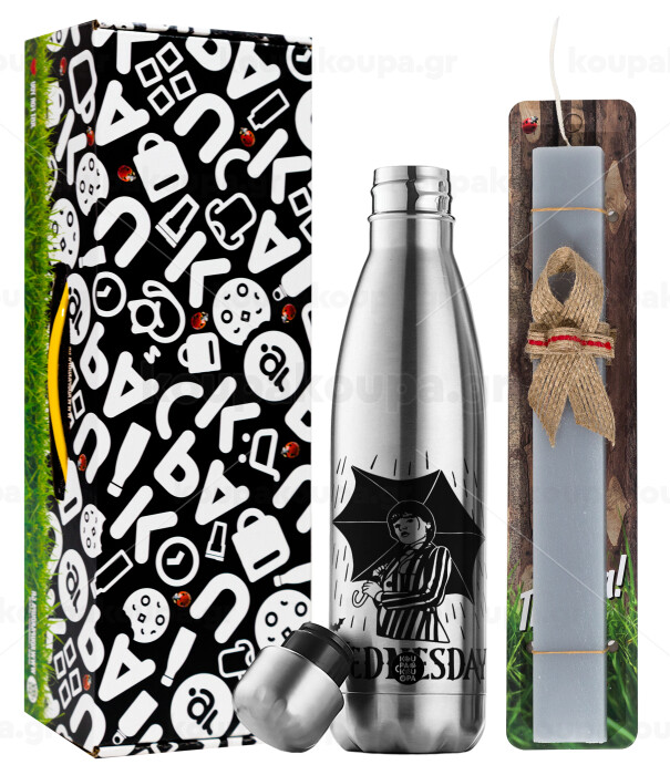 Wednesday Addams, Πασχαλινή Λαμπάδα με μεταλλικό παγούρι θερμός ανοξείδωτο (500ml) & κερί αρωματικό πλακέ (30cm) (ΓΚΡΙ)