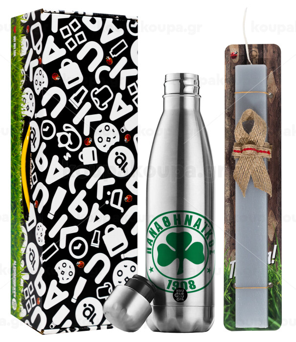 ΠΑΟ Παναθηναϊκός, Πασχαλινή Λαμπάδα με μεταλλικό παγούρι θερμός ανοξείδωτο (500ml) & κερί αρωματικό πλακέ (30cm) (ΓΚΡΙ)
