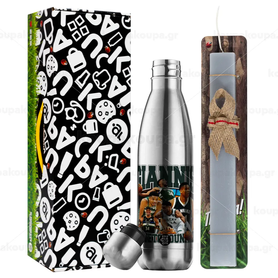 Giannis Antetokounmpo, Πασχαλινή Λαμπάδα με μεταλλικό παγούρι θερμός ανοξείδωτο (500ml) & κερί αρωματικό πλακέ (30cm) (ΓΚΡΙ)