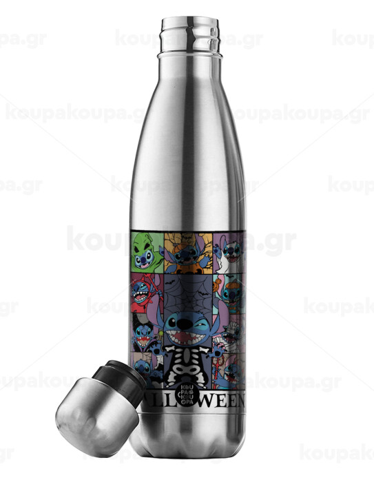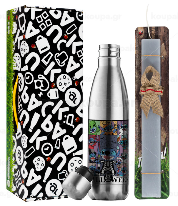 Stitch Halloween, Πασχαλινή Λαμπάδα με μεταλλικό παγούρι θερμός ανοξείδωτο (500ml) & κερί αρωματικό πλακέ (30cm) (ΓΚΡΙ)