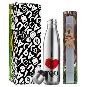 I Love You, Πασχαλινή Λαμπάδα με μεταλλικό παγούρι θερμός ανοξείδωτο (500ml) & κερί αρωματικό πλακέ (30cm) (ΓΚΡΙ)