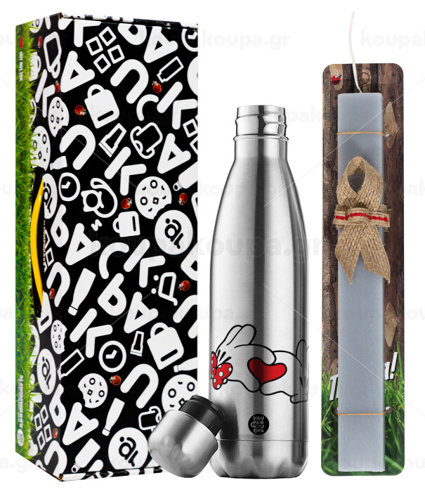 Love hands, Πασχαλινή Λαμπάδα με μεταλλικό παγούρι θερμός ανοξείδωτο (500ml) & κερί αρωματικό πλακέ (30cm) (ΓΚΡΙ)