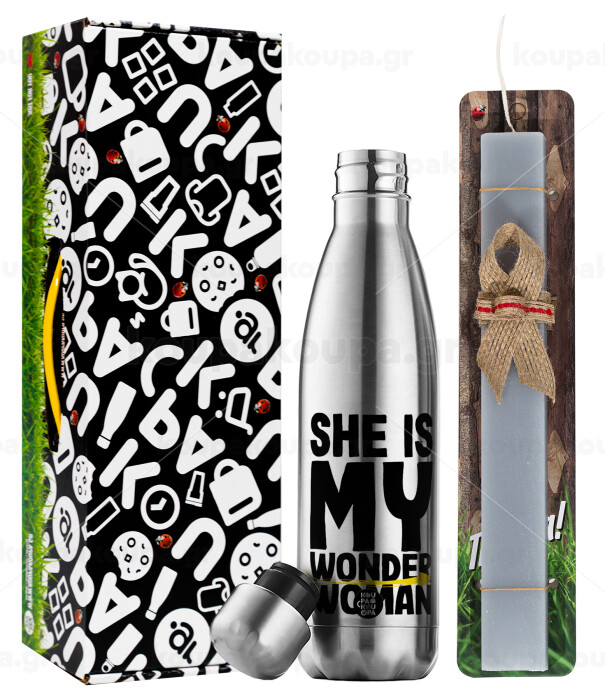 She is my wonder woman, Πασχαλινή Λαμπάδα με μεταλλικό παγούρι θερμός ανοξείδωτο (500ml) & κερί αρωματικό πλακέ (30cm) (ΓΚΡΙ)