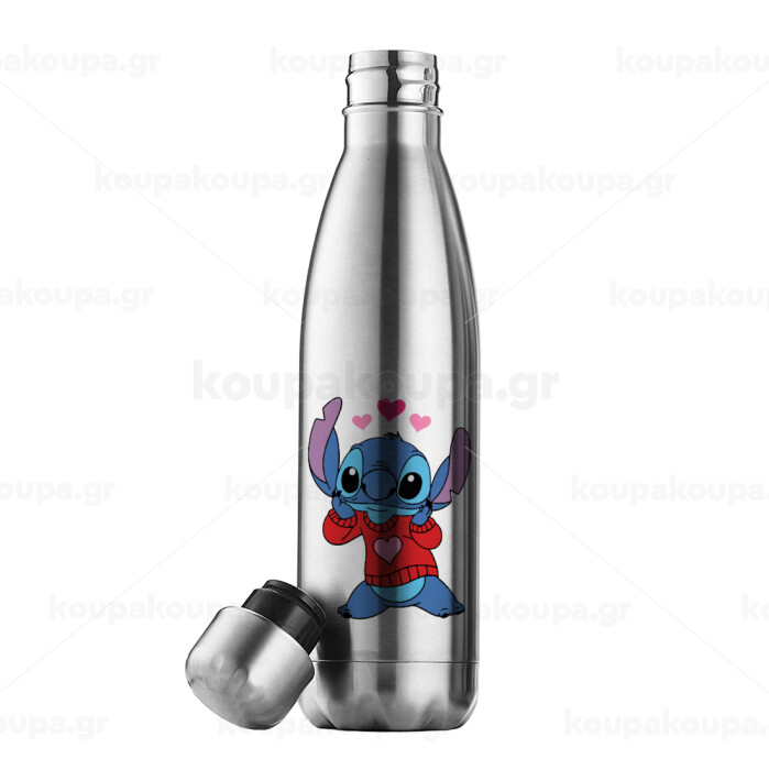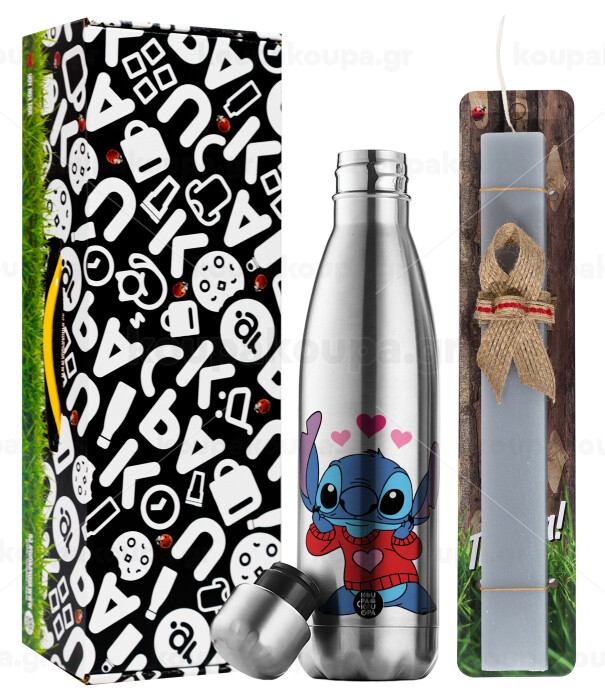 Stitch heart, Πασχαλινή Λαμπάδα με μεταλλικό παγούρι θερμός ανοξείδωτο (500ml) & κερί αρωματικό πλακέ (30cm) (ΓΚΡΙ)