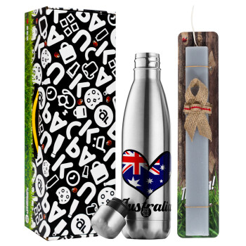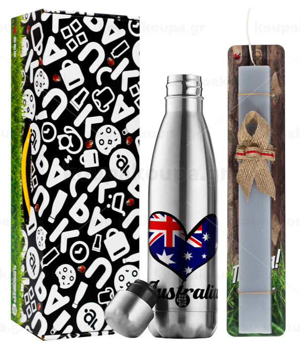 Australia flag, Πασχαλινή Λαμπάδα με μεταλλικό παγούρι θερμός ανοξείδωτο (500ml) & κερί αρωματικό πλακέ (30cm) (ΓΚΡΙ)