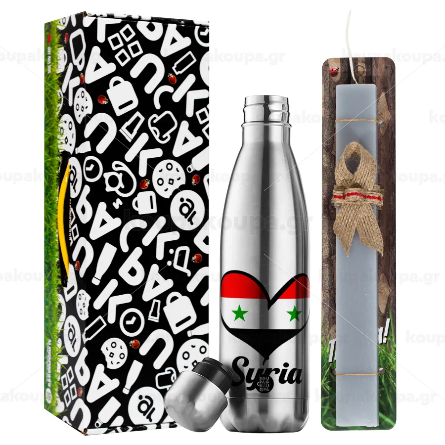 Syria flag, Πασχαλινή Λαμπάδα με μεταλλικό παγούρι θερμός ανοξείδωτο (500ml) & κερί αρωματικό πλακέ (30cm) (ΓΚΡΙ)