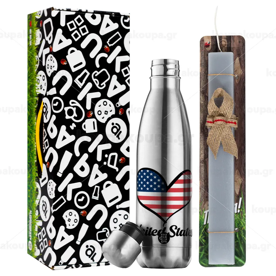 USA flag, Πασχαλινή Λαμπάδα με μεταλλικό παγούρι θερμός ανοξείδωτο (500ml) & κερί αρωματικό πλακέ (30cm) (ΓΚΡΙ)
