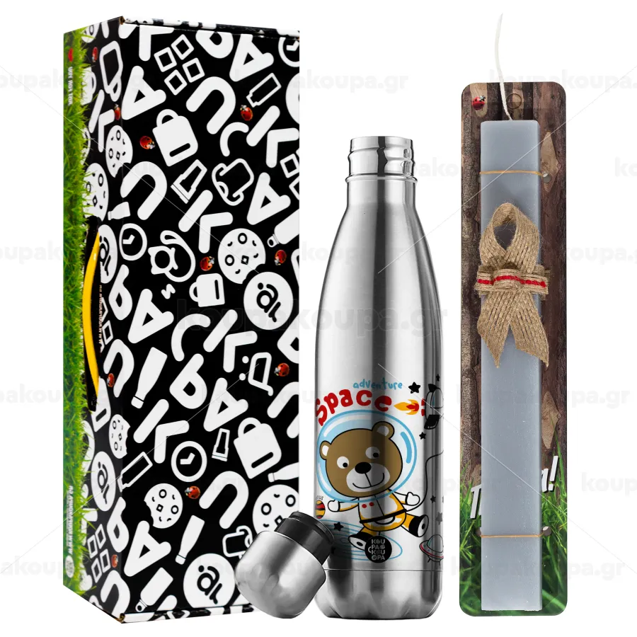 Ο μικρός αστροναύτης, Πασχαλινή Λαμπάδα με μεταλλικό παγούρι θερμός ανοξείδωτο (500ml) & κερί αρωματικό πλακέ (30cm) (ΓΚΡΙ)