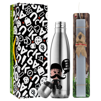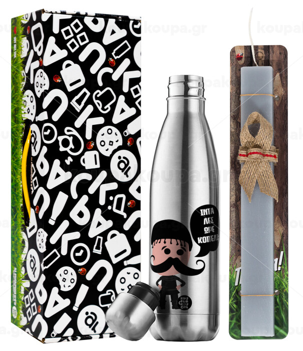 Κρητικός "Ίντα λες ωρέ κοπέλι", Πασχαλινή Λαμπάδα με μεταλλικό παγούρι θερμός ανοξείδωτο (500ml) & κερί αρωματικό πλακέ (30cm) (ΓΚΡΙ)