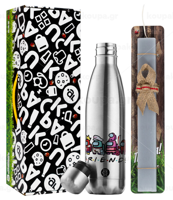 Among US Friends, Πασχαλινή Λαμπάδα με μεταλλικό παγούρι θερμός ανοξείδωτο (500ml) & κερί αρωματικό πλακέ (30cm) (ΓΚΡΙ)